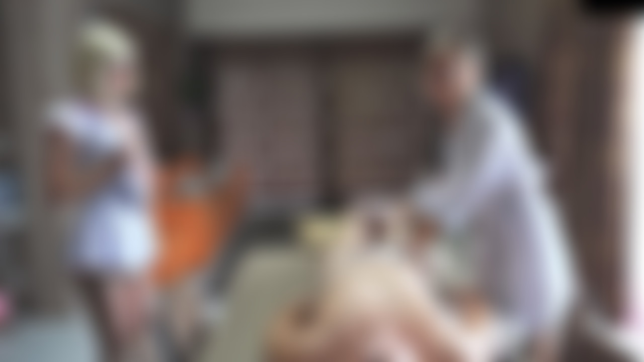 The medical professionals take turns giving the stunt-cock a handjob (with lube), then he fucks the nurse in standing doggy while the doctor looks on, touching herself