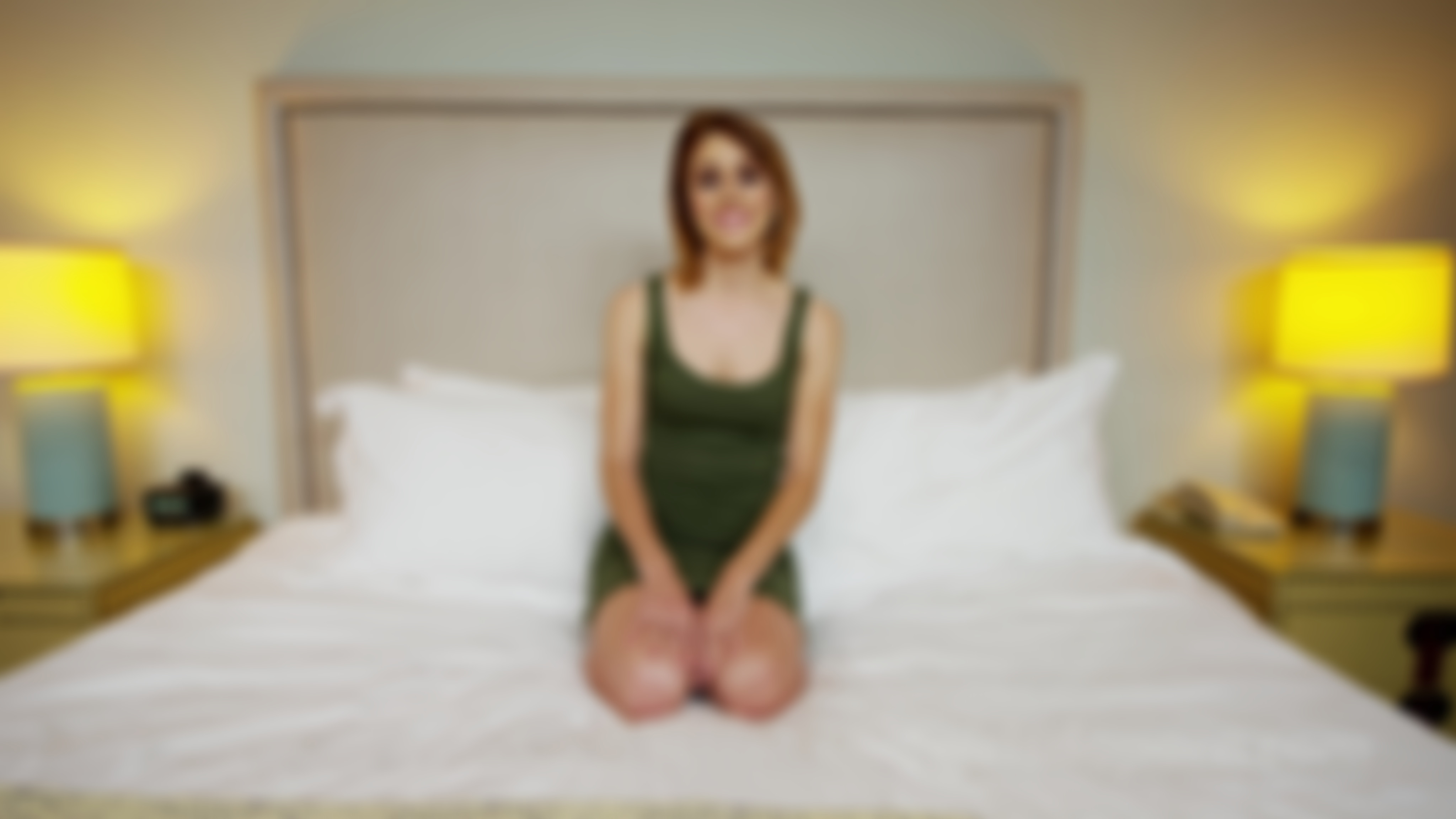 18 Year old pretty teen in a green dress goes for the interview on a bed. She is a barista who also likes soccer. Her favorite